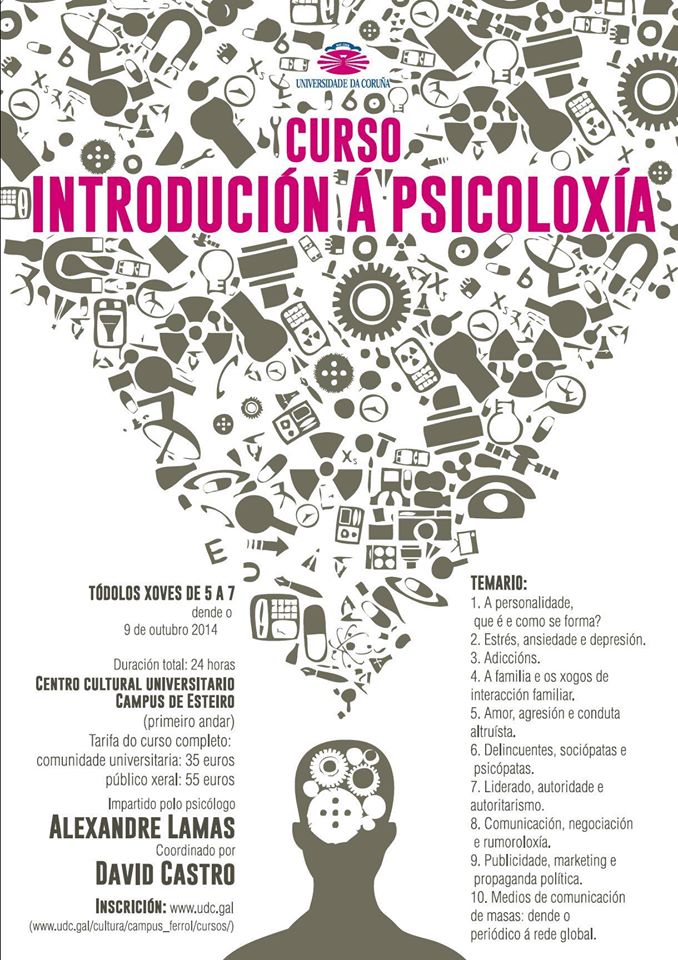 En colaboración con el Area de Cultura de Ferrol de la Universidad de A Coruña, hemos creado este curso de psicología de carácter generalista y asequible pero riguroso, cuyos contenidos, a través de la exposición teórica, proporcionan una visión global de los actuales desarrollos en este campo del conocimiento.